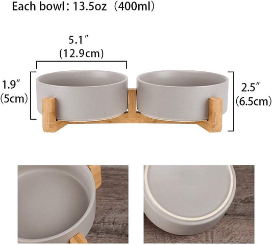 Ceramic Cat Dog Bowl Dish with Wood Stand No Spill Pet Food Water Feeder Cats Small Dogs Set of 2